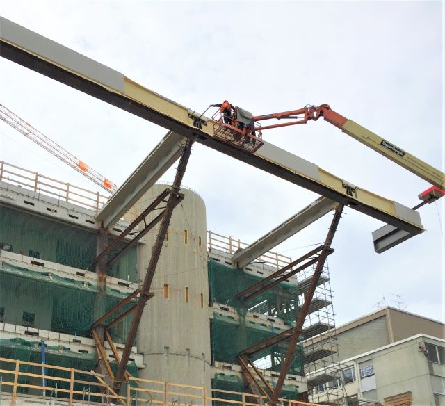 Les plafonds nervurés au-dessus du rez-de-chaussée et du 1er étage ont été réalisés avec des câbles de précontrainte afin de permettre les grandes portées. En outre, des poutres de façade préfabriquées au 4e étage ont été ancrées et reliées par des câbles de précontrainte, et 2 pans de mur au 4e et 5e étage ont été réalisés avec une précontrainte.
